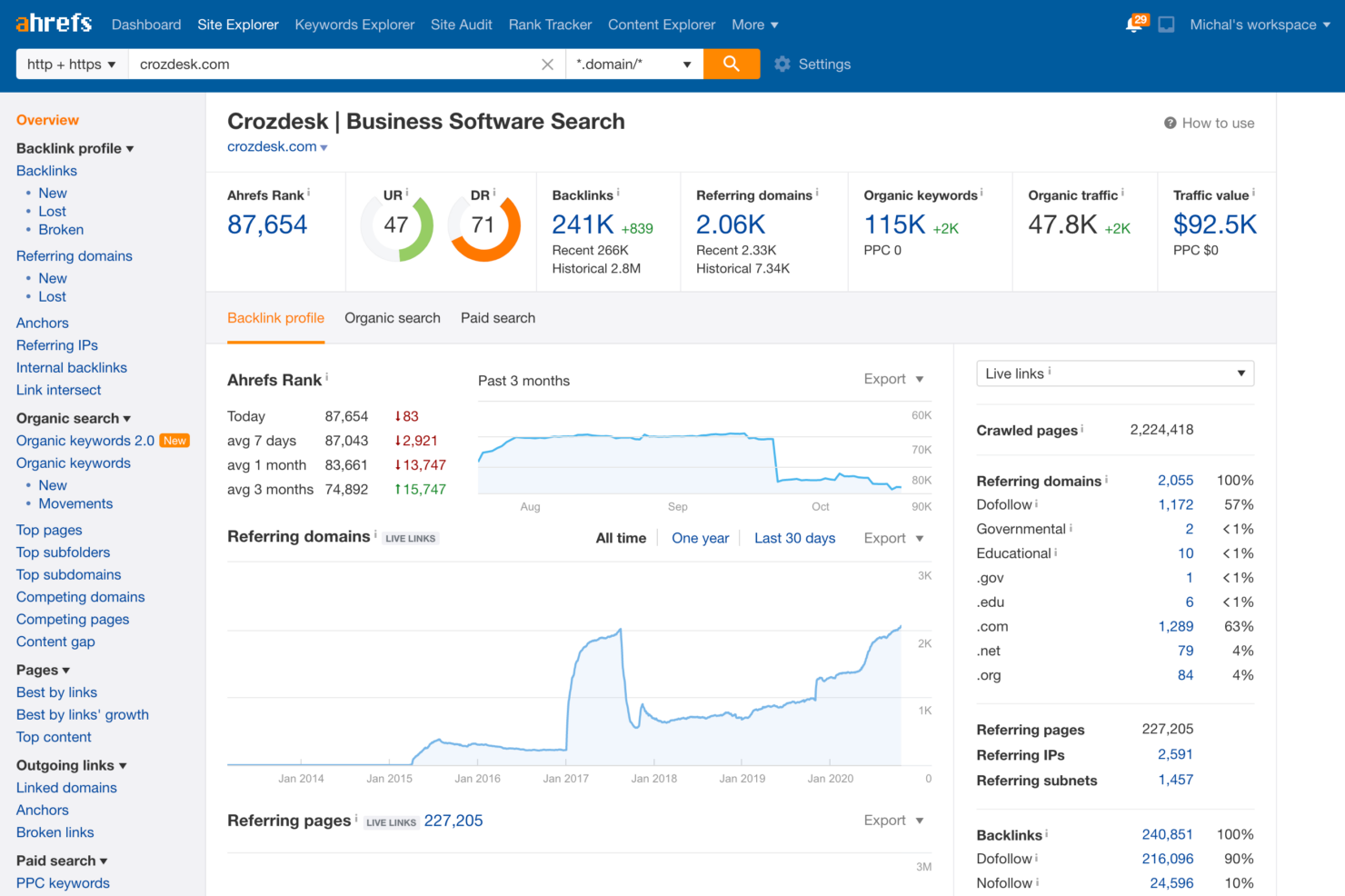 | Feature Depth | Offers SEO, content marketing (everything from content strategy assistance and a content explorer to on-page SEO recommendations), PPC, and social media tools in one suite. | Focuses mainly on SEO (position tracking, keyword tracking, traffic potential, etc.) and backlink analysis tools (including a backlink checker, a link building tool, backlink reports, and tools for broken backlinks). |